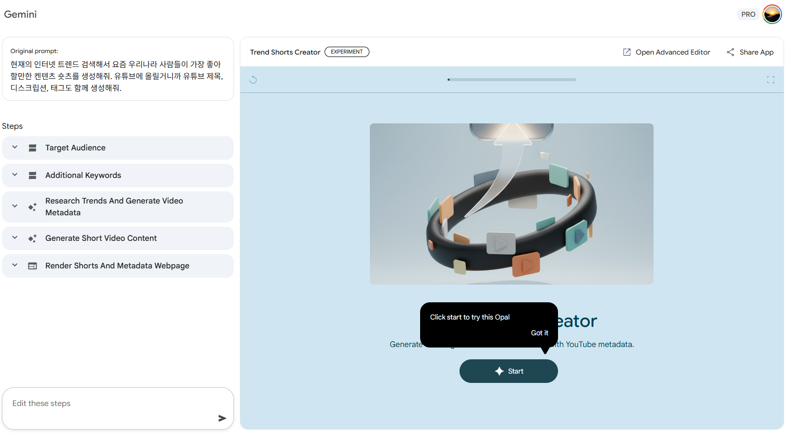 2. 펼쳐진 Gems 목록에서 Trend Shorts Creator를 클릭합니다.