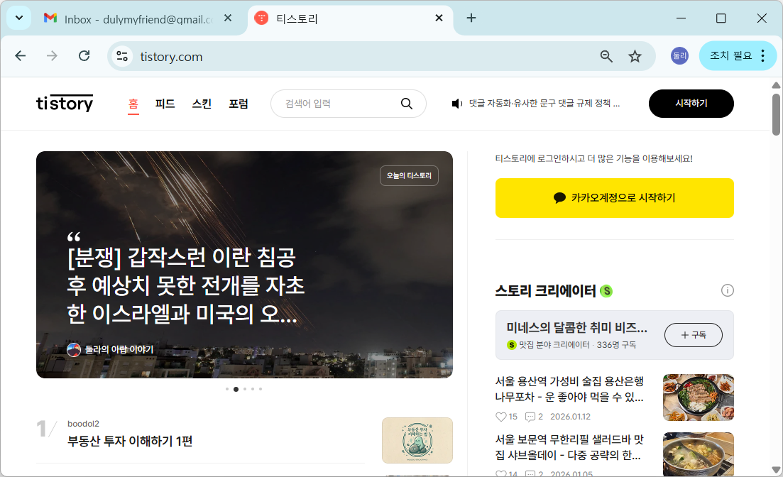 1. 크롬 블라우저를 실행하고, 검색창에 '티스토리'를 치고 티스토리 홈(tistory.com)에 접속합니다. [카카오계정으로 시작하기] 또는 [시작하기]를 누릅니다.