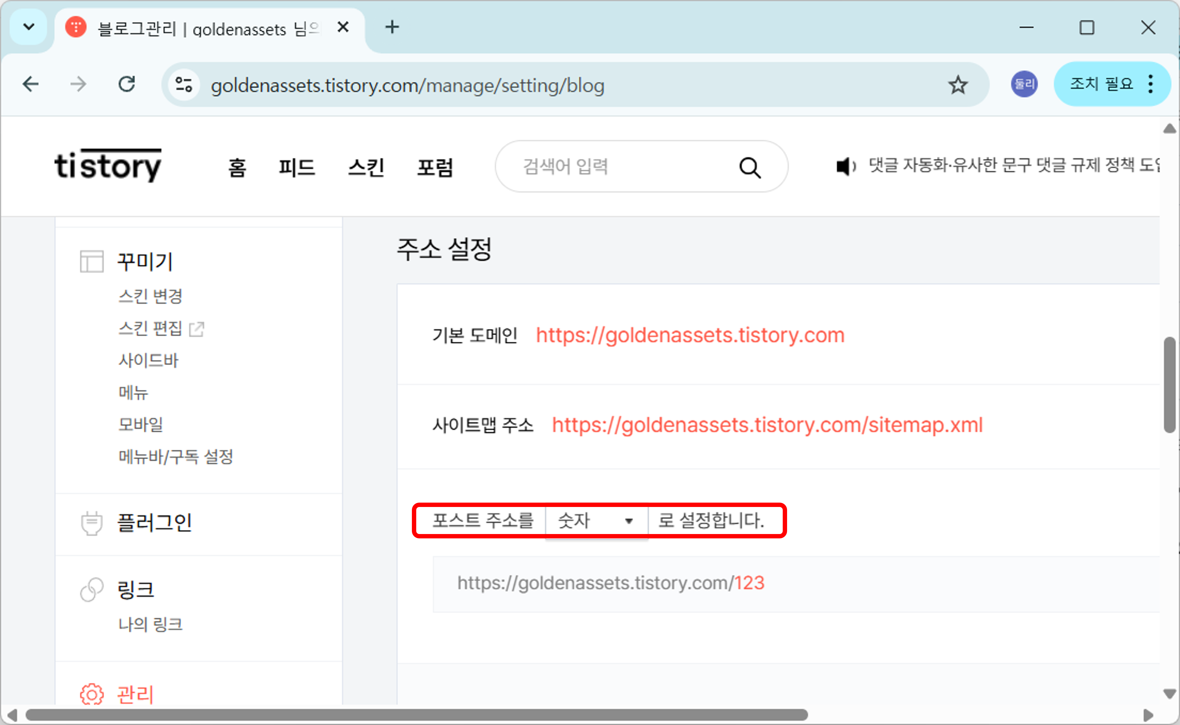 4. 세가지를 입력했다면, 조금 아래로 내려가 볼게요. [주소 설정] 항목에서, 세번째 줄에 '포스트 주소를 [숫자]로 설정합니다'를 찾으셨나요?