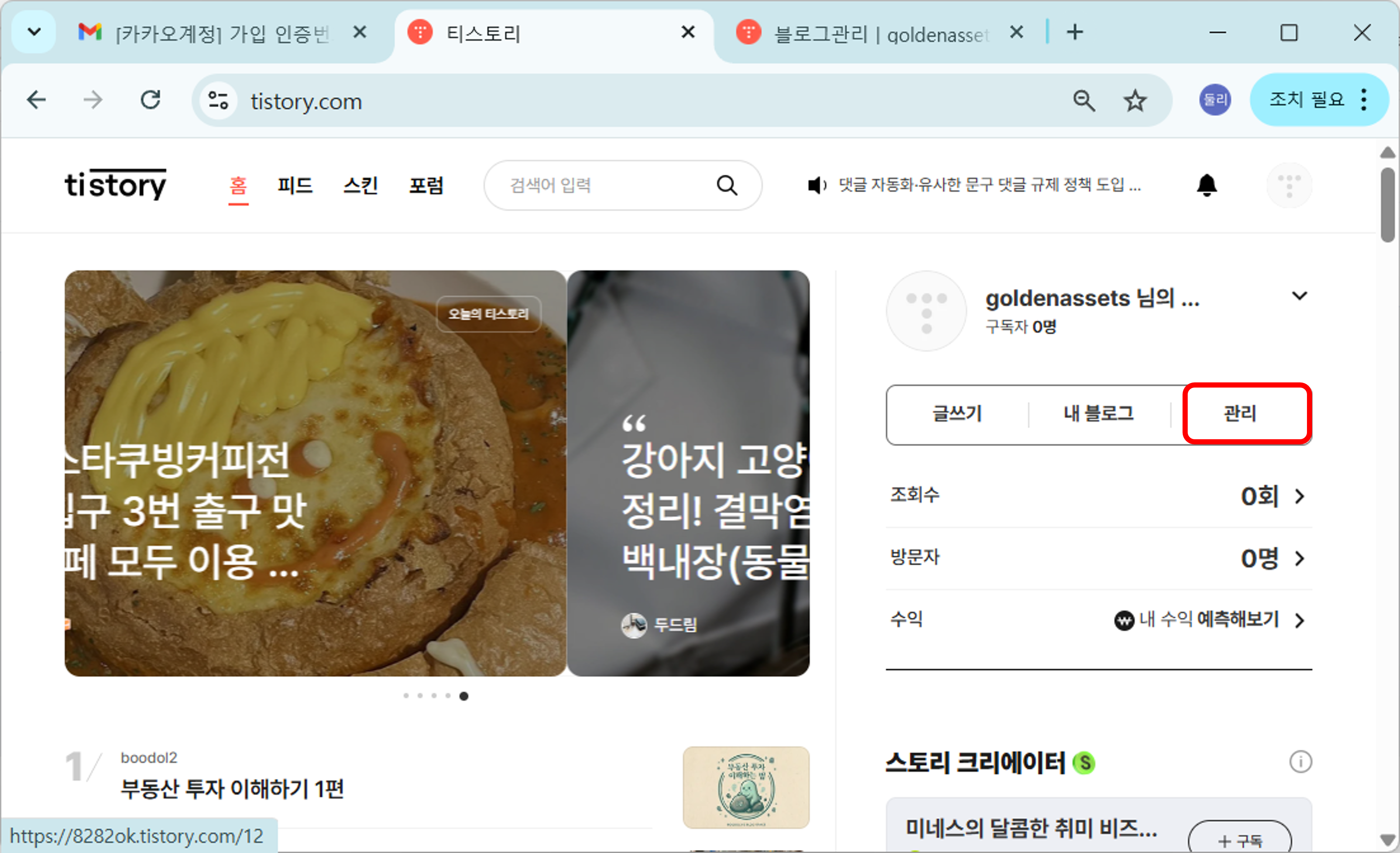 1. 블로그에 로그인하면, 항상 아래와 같은 화면을 만나게 됩니다. 조회수와 방문자수, 광고 수익으로 벌어들은 달러가 표시됩니다. [관리] 메뉴를 누릅니다.