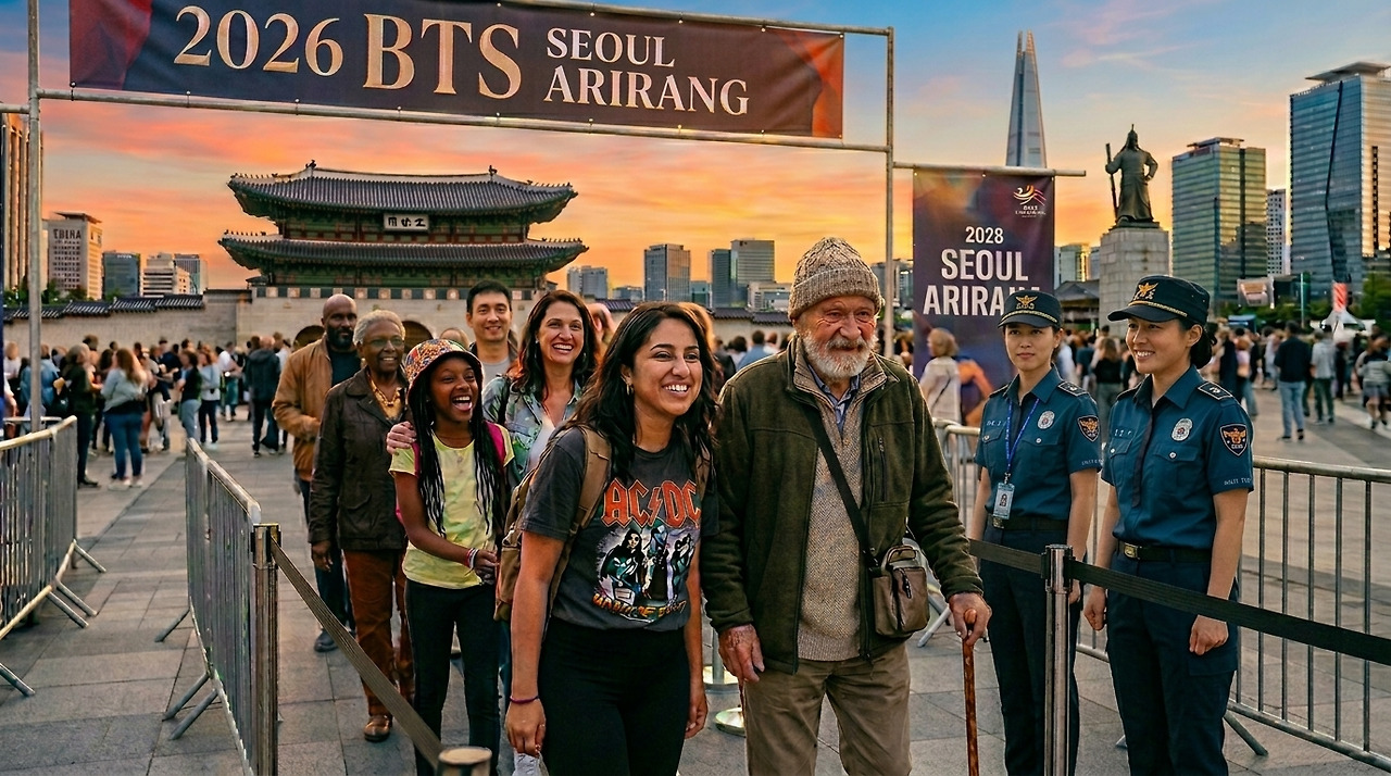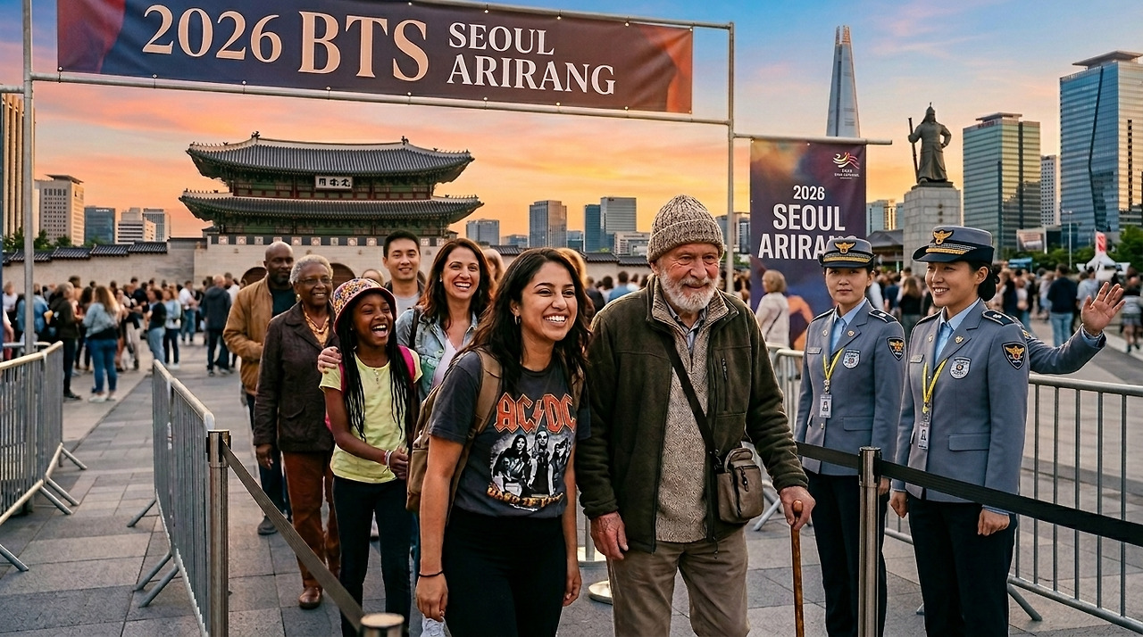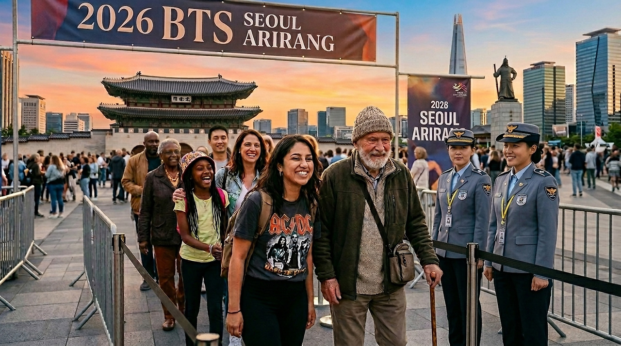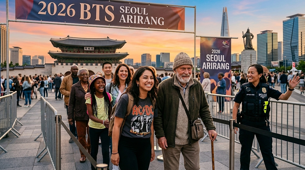 | 배경을 광화문 광장으로 바꾸고, 배너 현수막 광고는 '2026 BTS SEOUL ARIRANG'으로 바꿔줘. 다른 요소 변경 절대 금지. |