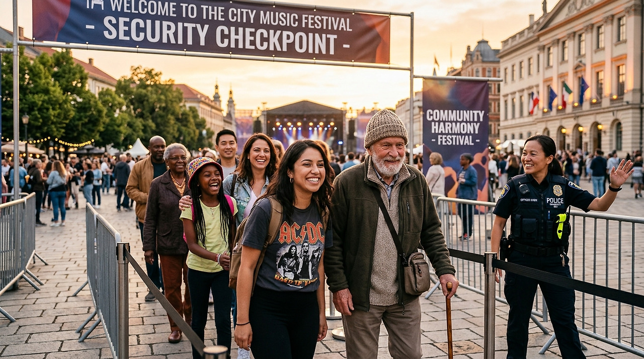Prompt: A close-up shot of a diverse group of people, including young fans and elderly citizens, smiling and walking in an orderly line through a security checkpoint in a city square. The sun is setting, casting a warm glow. In the background, a police officer kindly directs the way. Feeling of safety, community, and harmony.